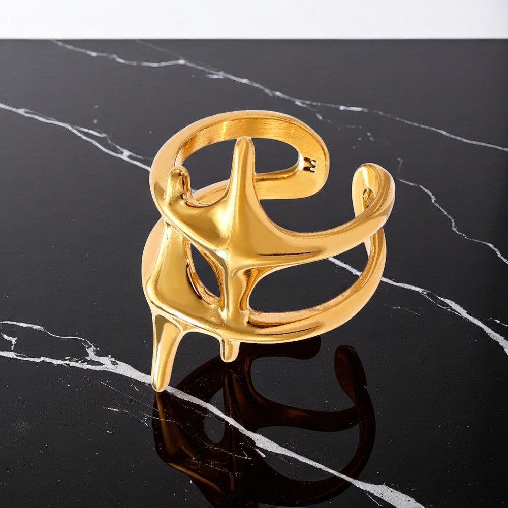 Futuristisch anmutender Ring aus vergoldetem oder silbernem Edelstahl mit doppelt geschwungenem Design – auffällig, unisex und modern.