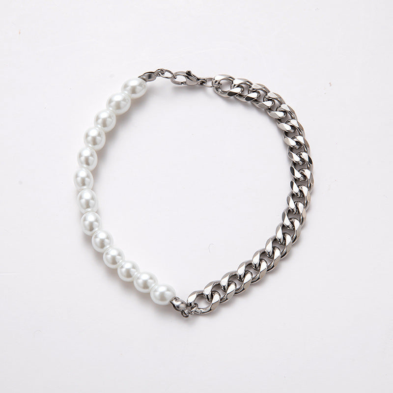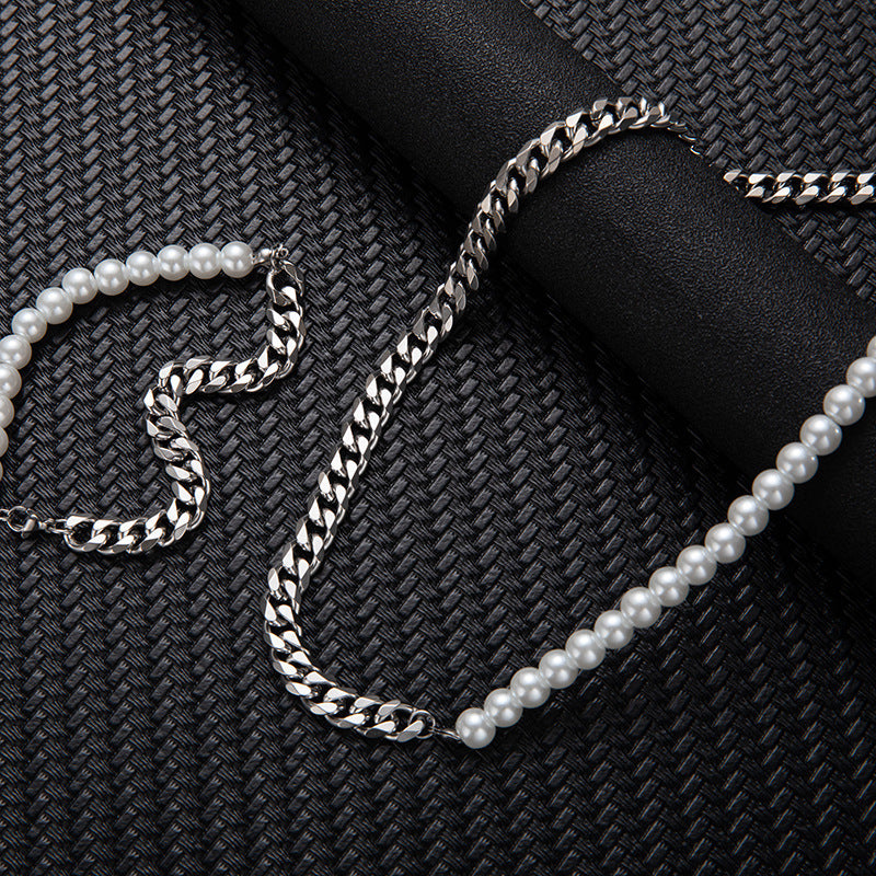 Dieses Schmuckstück vereint klassisches Design mit modernem Twist: glänzende Perlen treffen auf kantige Figaro-Kettenglieder aus robustem Titanstahl. Der kontrastreiche Materialmix verleiht dem Piece eine spannende Textur – perfekt, um deinen Look aufzuwerten. Ob als Kette oder Armband, dieses Accessoire passt zu urbaner Streetwear genauso wie zu eleganten Outfits.